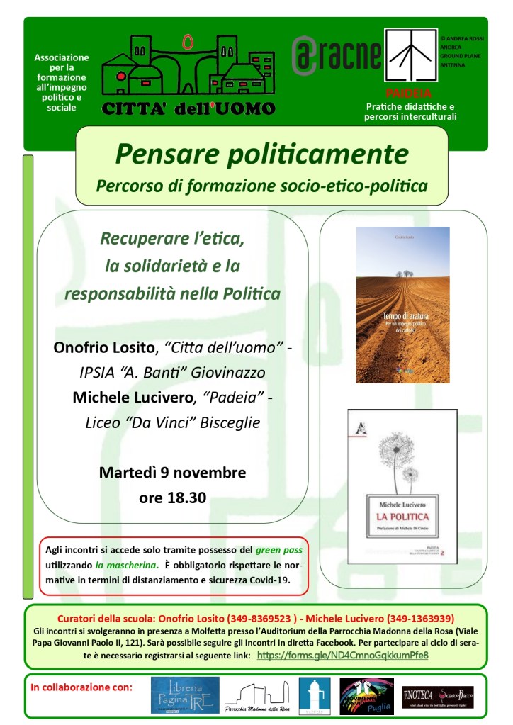 […] Recuperare l’etica, la solidarietà e la responsabilità nella PoliticaOnofrio Losito, Associazione “Citta dell’uomo”Michele Lucivero, Liceo “Da Vinci”, BisceglieMartedì 9 novembre ore 18.30 […]