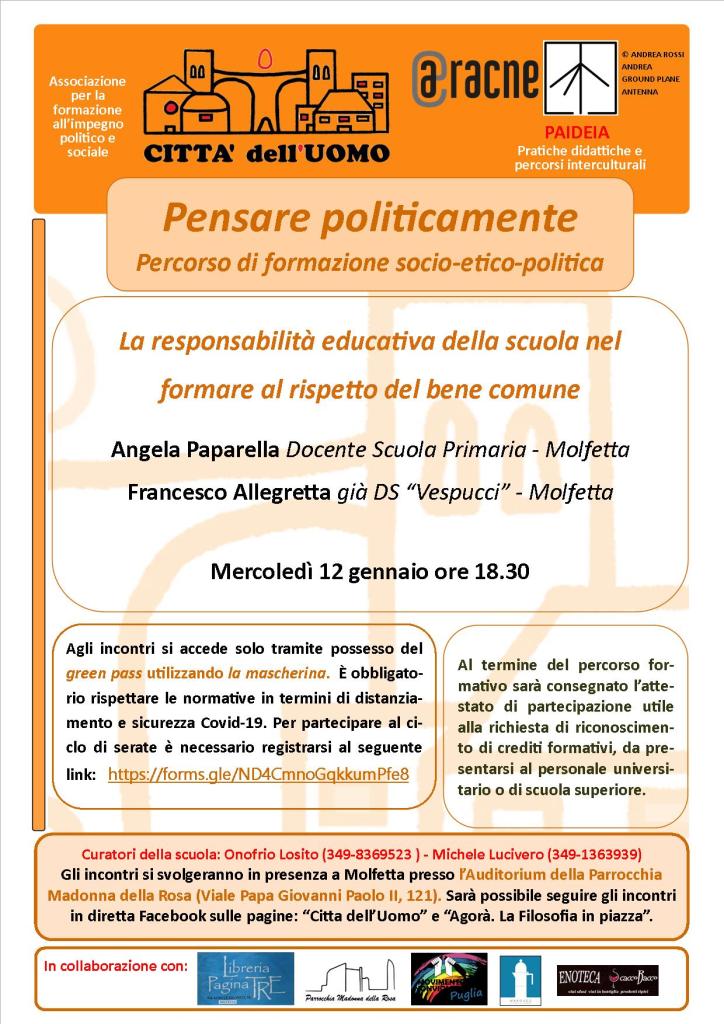 […] La responsabilità educativa della scuola nel formare al rispetto del bene comuneAngela Paparella, I.C. “Battisti-Pascoli” MolfettaFrancesco Allegretta, già DS “Vespucci” MolfettaMartedì 11 gennaio ore 18.30 […]