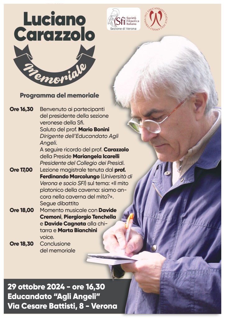 Ad un anno dalla scomparsa del caro socio della Società Filosofica Italiana, Luciano Carazzolo, la sezione veronese ha organizzato una lezione e un memoriale in suo onore, che si terrà il 29 ottobre alle 16,30 presso il Teatro dell’Educandato “Agli Angeli” di Verona per ricordarlo insieme ai suoi cari.