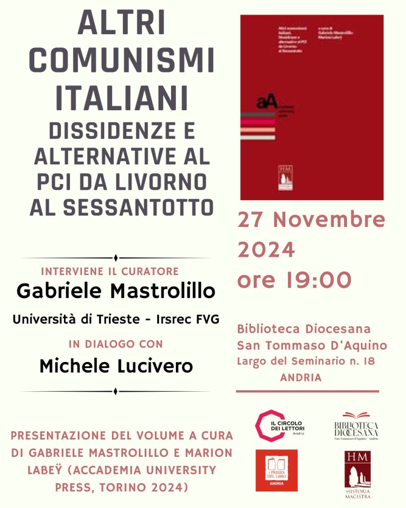 Si svolgerà ad Andria, (BT) la presentazione del libro “Altri comunismi italiani. Dissidenze e alternative al PCI da Livorno al Sessantotto“, curato da Gabriele Mastrolillo e Marion Labey edito da Accademia University Press, Torino 2024.