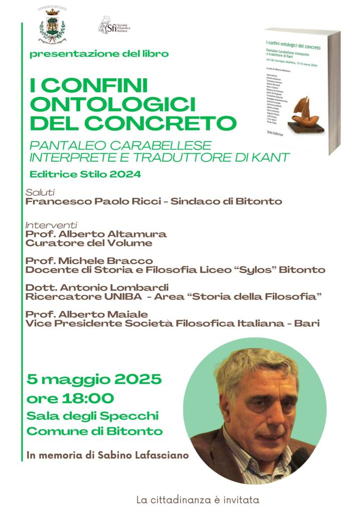 Segnaliamo con piacere la presentazione del volume I confini ontologici del concreto. Pantaleo Carabellese interprete e traduttore di Kant (Stilo edizioni), che si svolgerà a Bitonto il 5 maggio 2025 presso la Sala degli Specchi del Comune.