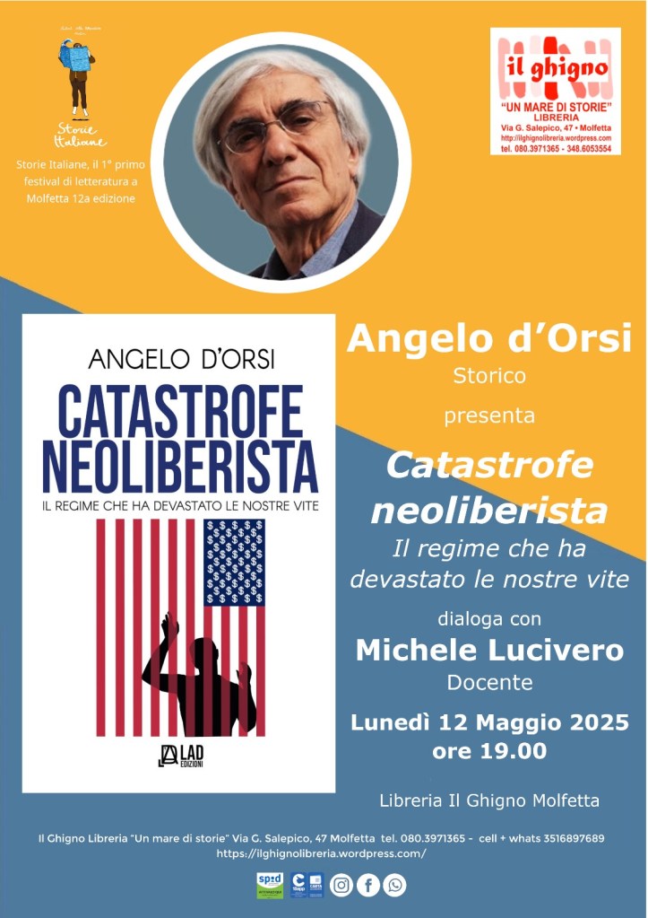 Lunedì, 12 maggio alle ore 19.30 Angelo D’Orsi, storico del pensiero politico, allievo di Norberto Bobbio e tra i massimi esperti internazionali di Antonio Gramsci, presenta il suo nuovo libro Catastrofe neoliberista” Il regime che ha devastato le nostre vite, Lad edizioni, nell’ambito della rassegna Waiting for Storie Italiane, il 1° primo festival di letteratura a Molfetta 13a edizione, presso la Libreria Il Ghigno.