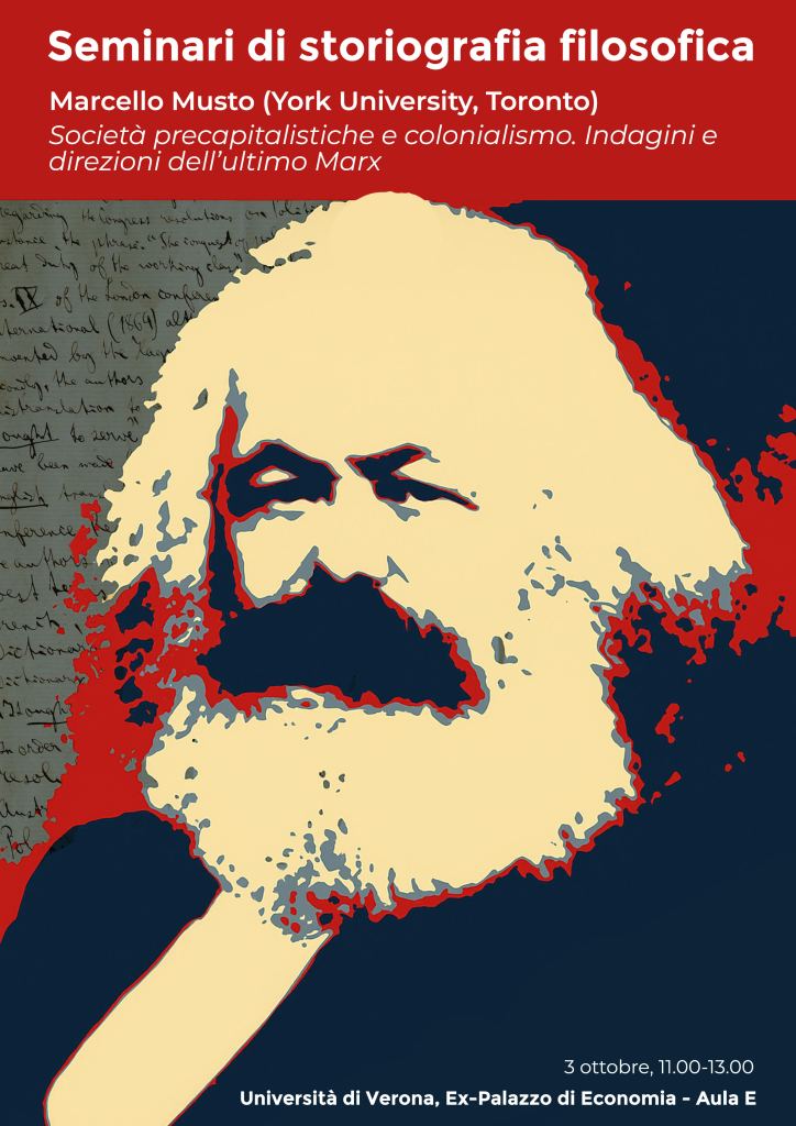 Il Seminario di storiografia filosofica, al quale interverrà il prof. Marcello Musto (York University, Toronto) si terrà presso l’Università di Verona, il 3 ottobre dalle 11 alle 13, e tratterà di Società precapitalistiche e colonialismo. Indagini e direzioni dell’ultimo Marx.