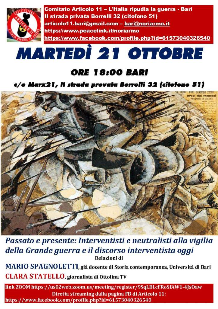 Si terrà martedì 21 ottobre alle ore 18:00 a BARI c/o Marx21, II strada privata Borrelli 32 (citofono 51) l’incontro dal titolo Passato e presente: Interventisti e neutralisti alla vigilia della Grande guerra e il discorso interventista oggi.