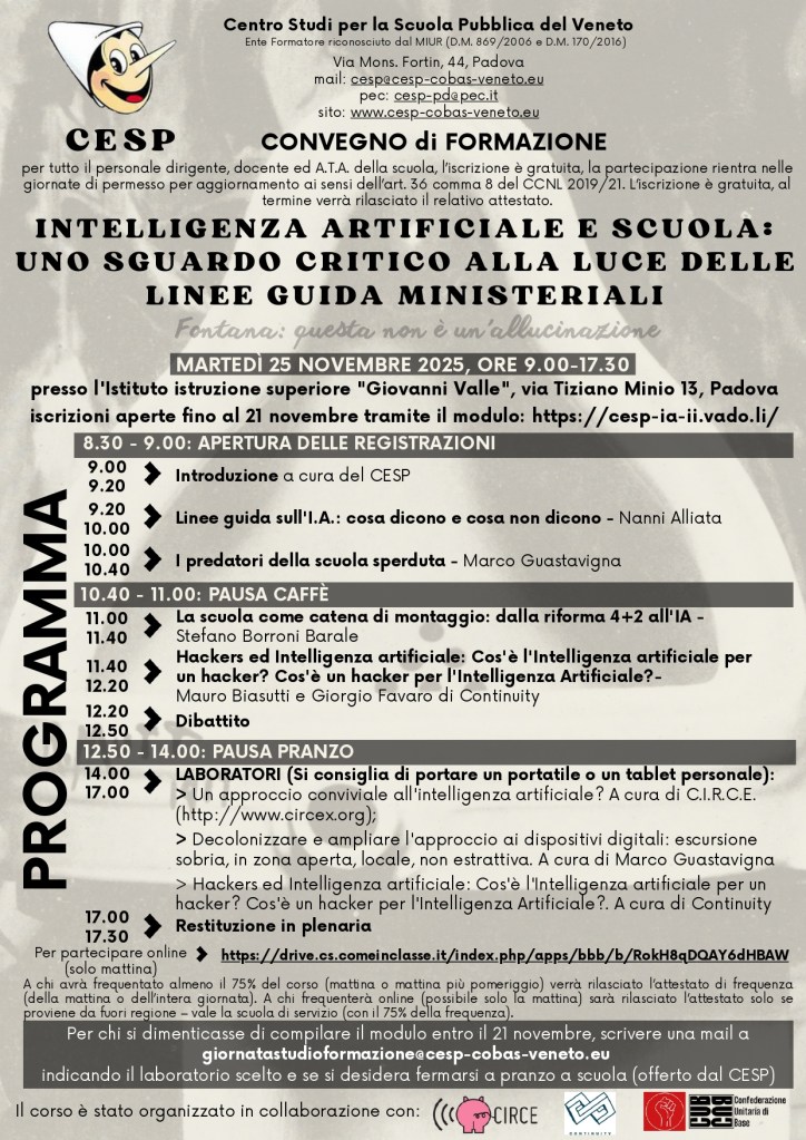 Segnaliamo un interessante e utile CONVEGNO NAZIONALE DI FORMAZIONE in presenza e a distanza organizzato dal CESP del Veneto dal titolo “INTELLIGENZA ARTIFICIALE E SCUOLA: uno sguardo critico alla luce delle Linee Guida ministeriali“.