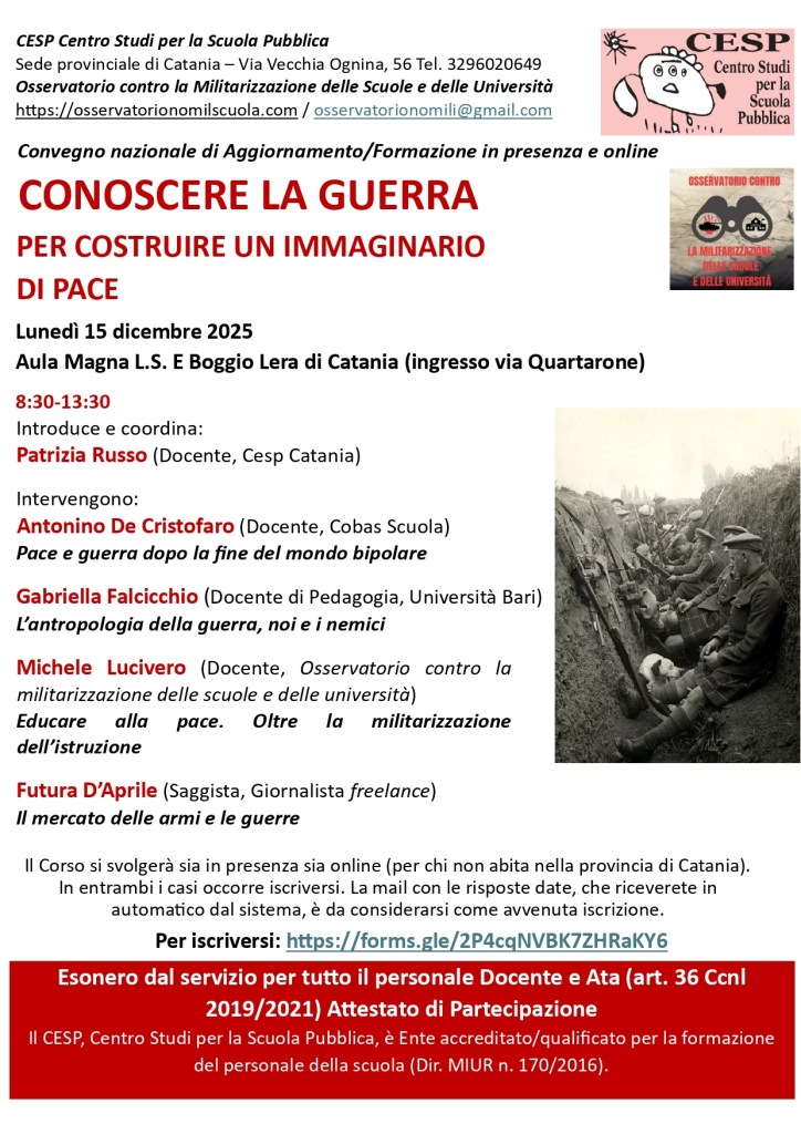 Si svolgerà lunedì 15 dicembre 2025 dalle ore 8:30 fino alle 13:30 a Catania, presso il Liceo Scientifico “Enrico Boggio Lera“, il Convegno di Formazione e Aggiornamento in presenza e online per il personale scolastico organizzato dal CESP (Centro Studi per la Scuola Pubblica) con la collaborazione dell’Osservatorio contro la militarizzazione delle scuole e delle università dal titolo “Conoscere la guerra per costruire un immaginario di pace“.