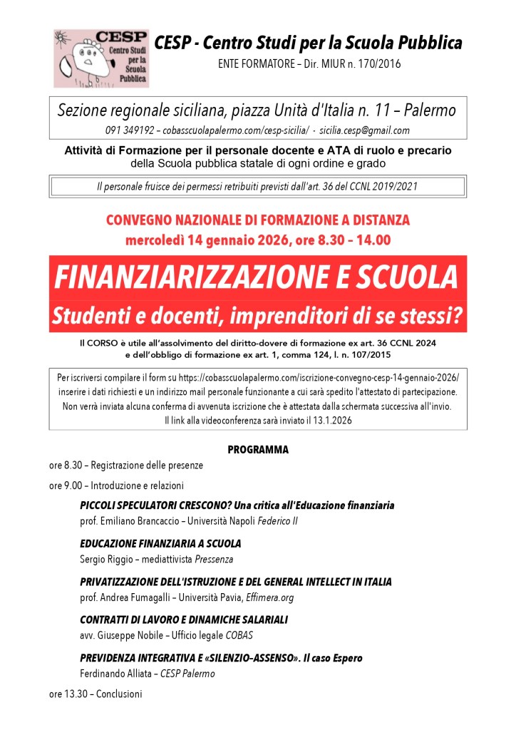 Per tutte le info: https://cobasscuolapalermo.com/2025/12/30/finanziarizzazione-e-scuola-studenti-e-docenti-imprenditori-di-se-stessi-convegno-14-1-2026/