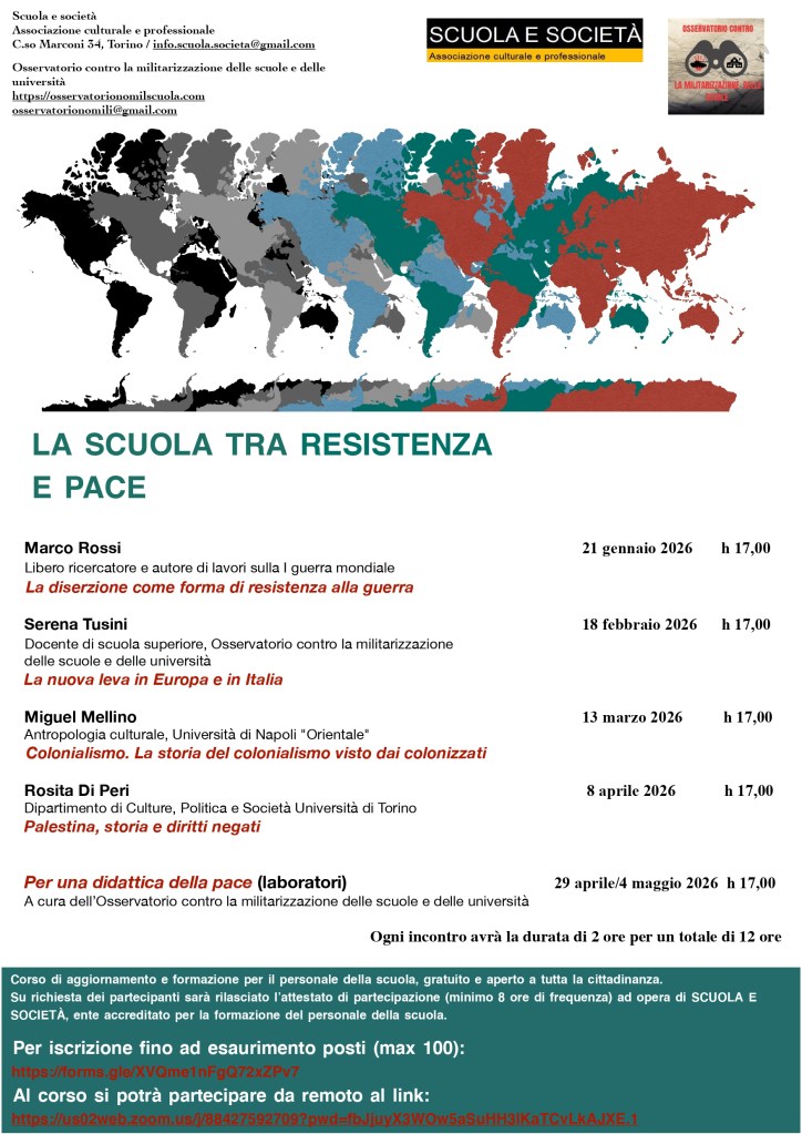 L’Osservatorio contro la militarizzazione delle scuole e delle università in collaborazione con Scuola e Società, ente di formazione riconosciuto dal Ministero dell’Istruzione e del Merito, ha messo a punto una proposta di formazione e aggiornamento gratuita e online di 12 ore in totale.