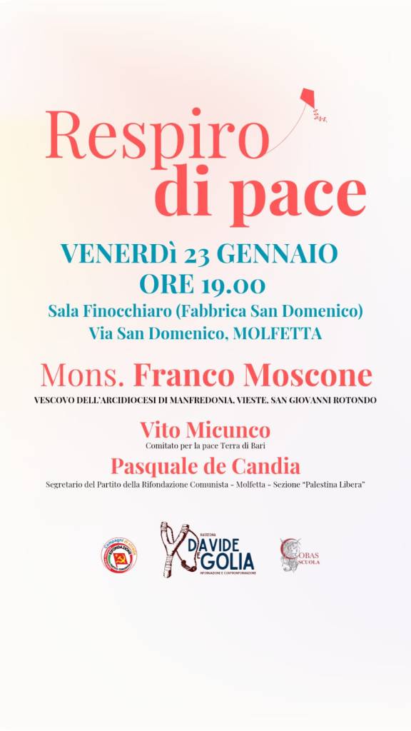 Segnaliamo a Molfetta venerdì 23 gennaio 2026 alle ore 19:00 un’iniziativa interessante nell’ambito della rassegna “Davide e Golia“, organizzata dal circolo di Rifondazione Comunista di Molfetta insieme alla sede locale del Sindacato Cobas Scuola. L’iniziativa, a cui è stata data il titolo Respiro di Pace, sarà dedicata all’analisi delle prospettive pacifiste, nonviolente e antimilitariste con: