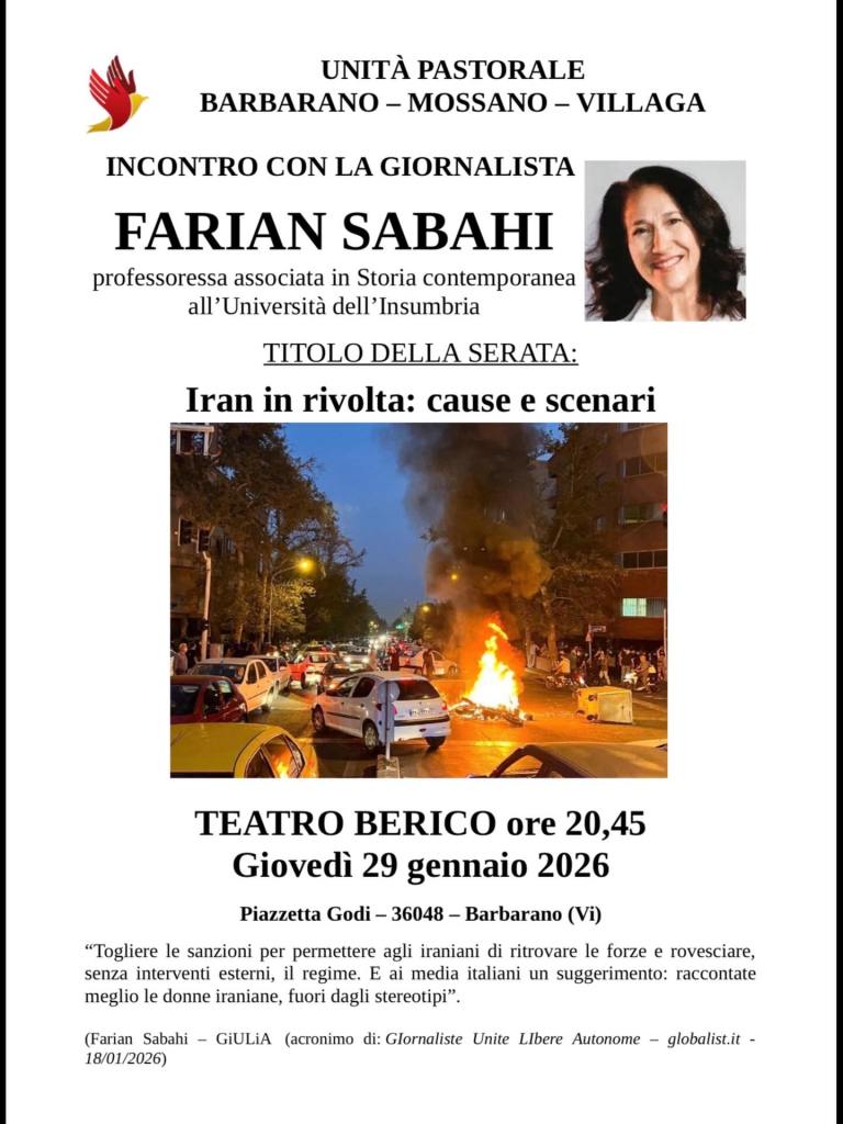 29 gennaio 2026: Farian Sabahi – giornalista e prof.ssa associata in Storia Contemporanea all’Università dell’Insubria – terrà una conferenza presso il Teatro Berico di Barbarano (VI) dal titolo: Iran in rivolta. Cause e scenari.