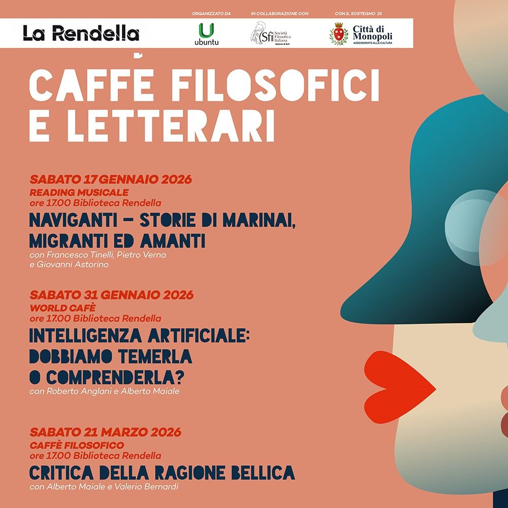 Segnaliamo un interessante World Cafè a Monopoli (BA) il 31 gennaio 2026 alle ore 17:00 presso la biblioteca Rendella con Roberto Anglani e Alberto Maiale dal titolo “AI: dobbiamo temerla o comprenderla?”, organizzato dalla sezione barese della Società Filosofia Italiana.
