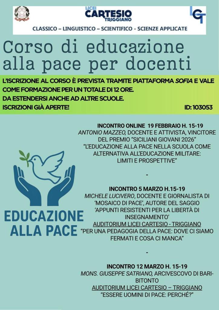 Segnaliamo con piacere questo corso di formazione gratuito organizzato dai Licei “Cartesio” di Triggiano (BA) sotto la coordinazione di Francesco Minervini, docente, attivista e autore di numerosi saggi sul pacifismo, con due promotori dell’Osservatorio contro la militarizzazione delle scuole e delle università.