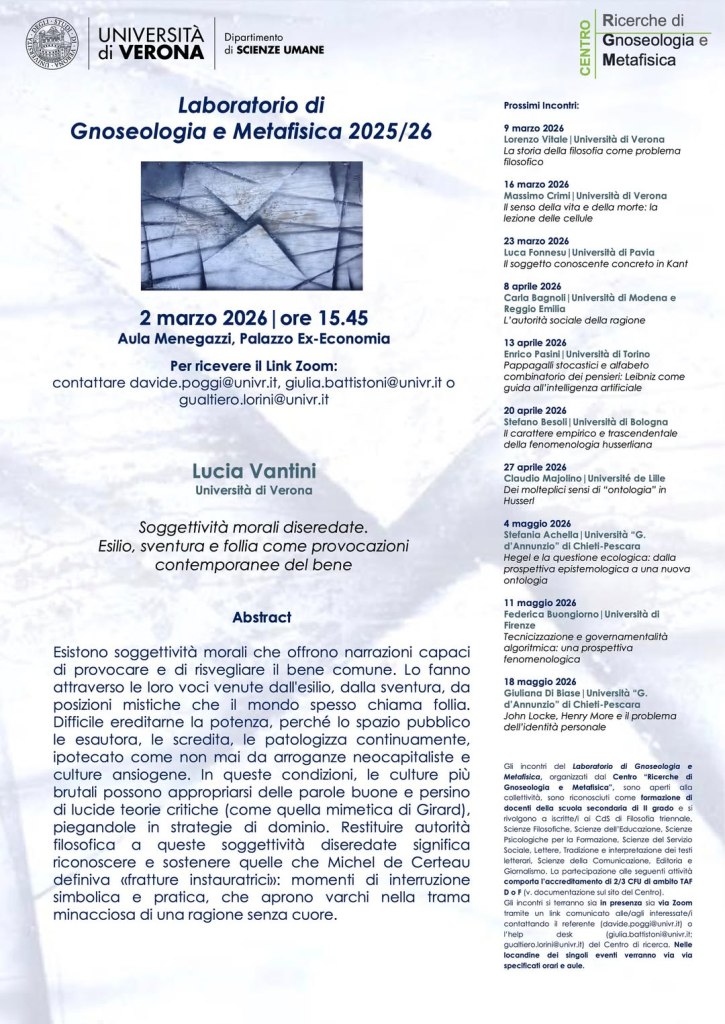 Comincia lunedì 2 marzo 2026 a Verona il Laboratorio di Gnoseologia e Metafisica. La prima lezione, tenuta dalla dott.ssa Lucia Vantini, presso l’Aula Menegazzi, (Palazzo Ex-Economia) alle 15.45, avrà il seguente titolo: Soggettività morali diseredate. Esilio, sventura e follia come provocazioni contemporanee del bene.