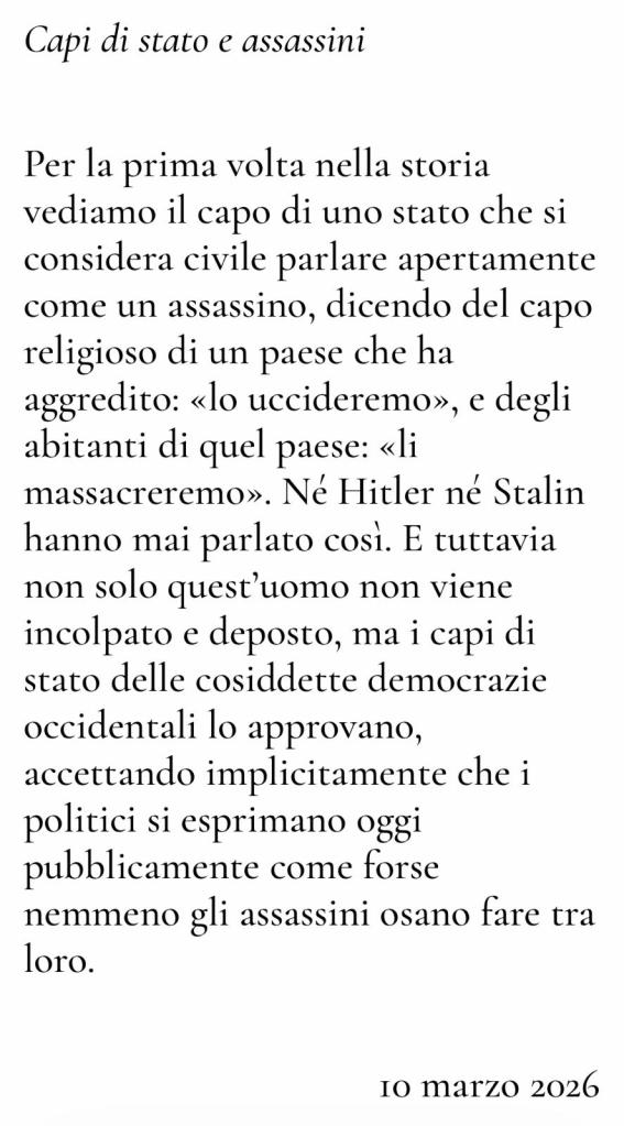 Per la prima volta nella storia vediamo il capo di uno stato che si considera civile parlare apertamente come un assassino, dicendo del capo religioso di un paese che ha aggredito: «lo uccideremo», e degli abitanti di quel paese: «li massacreremo». Né Hitler né Stalin hanno mai parlato così. E tuttavia non solo quest’uomo non viene incolpato e deposto, ma i capi di stato delle cosiddette democrazie occidentali lo approvano, accettando implicitamente che i politici si esprimano oggi pubblicamente come forse nemmeno gli assassini osano fare tra loro.