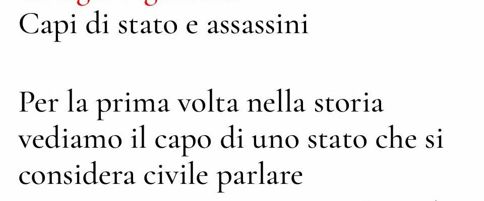 Per la prima volta nella storia vediamo il capo di uno stato che si considera civile parlare apertamente come un assassino, dicendo del capo religioso di un paese che ha aggredito: «lo uccideremo», e degli abitanti di quel paese: «li massacreremo». Né Hitler né Stalin hanno mai parlato così. E tuttavia non solo quest’uomo non viene incolpato e deposto, ma i capi di stato delle cosiddette democrazie occidentali lo approvano, accettando implicitamente che i politici si esprimano oggi pubblicamente come forse nemmeno gli assassini osano fare tra loro.