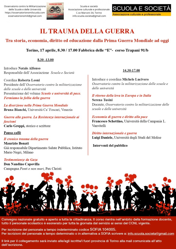 Dopo l’esperienza positiva degli ultimi due anni (clicca qui per il 2024 e qui per il 2025), l’Associazione ” Scuola e Società“, (soggetto accreditato alla formazione Decreto MIUR 5.7.2013 Elenco Enti Accreditati/Qualificati 23.11.2016) ha organizzato, in collaborazione con l’Osservatorio contro la militarizzazione delle scuole e delle università, a Torino per il 17 aprile 2026 un Convegno nazionale in presenza e online sul processo di militarizzazione dei luoghi della formazione e sul trauma rappresentato dalla guerra, nella quale ci troviamo sempre più coinvolti e coinvolte. Si cercherà, infatti, di analizzare da un punto di vista storico, economico, giuridico e pedagogico tutte le implicazioni negative che un orizzonte di guerra porta con sé, anche e soprattutto, in vista di una massiccia ripresa in tutta Europa della leva obbligatoria.