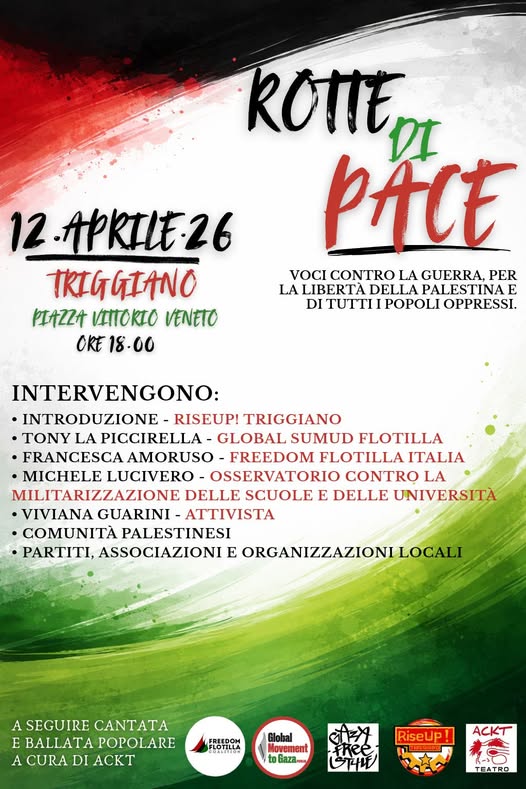Si terrà domenica 12 aprile a Triggiano (BA) l’incontro pubblico dal titolo “Rotte di Pace. Voci contro la guerra, per la libertà della Palestina e di tutti i popoli oppressi“. In un tempo in cui i conflitti si moltiplicano e la logica delle armi torna a dominare il dibattito internazionale, diventa sempre più urgente costruire spazi di informazione, consapevolezza e partecipazione.