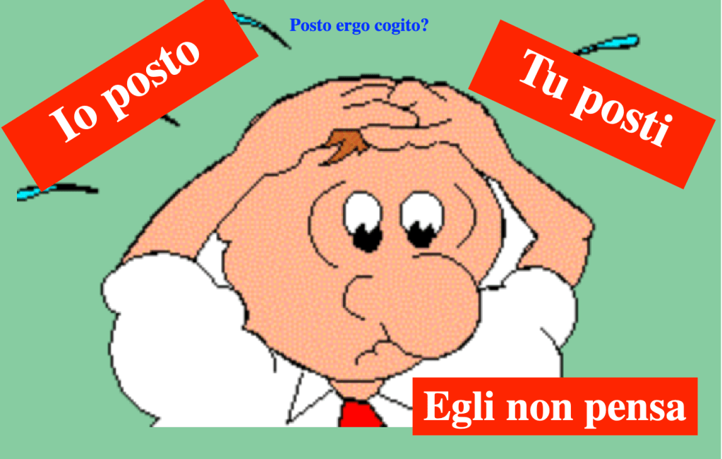 Posto ergo Cogito 14/04/2020, ML, “Posto ergo cogito?” n. 1, la rubrica sulla disinformazione via web: cominciamo dal video anti tedesco di Solenghi 16/04/2020, ML, “Posto ergo cogito?” n. 2, la web (dis)informazione nel e sul video di Solenghi: la storia, il negazionismo e la semplificazione 18/04/2020, ML, “Posto ergo cogito?” n. 3, la web (dis)informazione nel e sul video di Solenghi: nei pro e nei contro superficialità e sconfinamento 19/04/2020 ML, “Posto ergo cogito?” n. 4, la web (dis)informazione nel e sul video di Solenghi: ricorrente l’accusa di razzismo oppure quella di xenofobia 21/04/2020, ML, “Posto ergo cogito?” n. 5, la web (dis)informazione nel e sul video di Solenghi: l’accusa di populismo imperversa tra i commenti 25/04/2020, ML, “Posto ergo cogito?” n. 6, la web (dis)informazione nel e sul video di Solenghi: oggi è boom di sovranismo 28/04/2020, ML, “Posto ergo cogito?” n. 7, la web (dis)informazione nel e sul video di Solenghi: oggi tocca al generalismo e al qualunquismo 29/04/2020, ML, “Posto ergo cogito?” n. 8, la web (dis)informazione nel e sul video di Solenghi: in inglese o tedesco la diatriba su Mes ed Eurobond 01/05/2020, ML, “Posto ergo cogito?” n. 9, la web (dis)informazione nel e sul video di Solenghi: europeismo e anti europeismo a confronto 04/05/2020, ML, “Posto ergo cogito?” n. 10, la web (dis)informazione nel e sul video di Solenghi: l’autoinganno e la costruzione del nemico 08/05/2020, ML, “Posto ergo cogito?” n. 11, la web (dis)informazione nel e sul video Solenghi: la solidarietà tedesca e la vera solidarietà 20/06/2020, ML, Posto ergo cogito? Francesca e la sessualità, nel e sul video di Renzo Rosso: perché non correggere la Natura matrigna di Leopardi? 23/06/2020, ML, Posto ergo cogito? Francesca tra vocazione e provocazione, nel e sul video di Renzo Rosso: donarsi a Dio “il Bene” e non Natura matrigna 02/07/2020, ML, Posto ergo Cogito? Francesca e il gap generazionale tra boomer e doomer 11/09/2020, ML, Posto ergo cogito? Regolamento by Giovine (e duce?): meglio se lo approva il popolo del web ma se fa chiudere gli studi pugliesi noi Rucco non ce lo riprendiamo! Condividi: Condividi su WhatsApp (Si apre in una nuova finestra) WhatsApp Tweet Condividi su Telegram (Si apre in una nuova finestra) Telegram Invia un link a un amico via e-mail (Si apre in una nuova finestra) E-mail Stampa (Si apre in una nuova finestra) Stampa Mi piace Caricamento...